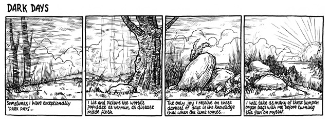 O.k., well as mentioned before, I made a small comic recently called ‘Dark Days and Other Tales,’ which I feel quite happy with, which is a rare occurrence. I tend to be quite critical of my own output, especially the newer things that haven’t quite had time to bed in yet. For whatever reason ‘Dark Days’ seems to work and people have been very responsive to it. It’s a collection of 25 comic strips born out of my fear of death and a need to make fun of it in order to stop it from consuming me in a panicky ball of anxiety.