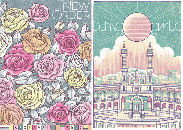 I get inspiration from loads of places, so not really from anyone or anything in particular At the moment I’m absolutely blown away by the new Chris Ware release ‘Building Stories’, I am listening obsessively to Cults Percussion Ensemble (14 year old Scottish girls playing percussive brilliance in the 70′s), and thinking a lot about Franz West and his untimely death. All of which I guess are current inspirations. From my contemporaries in the gig poster world, of late I have been loving the work of Shawn Knight, Doe-Eyed, Zeloot, Damien Tran and, as ever, Jay Ryan. He is a king among fragile, nerdy men and an awesome human man.