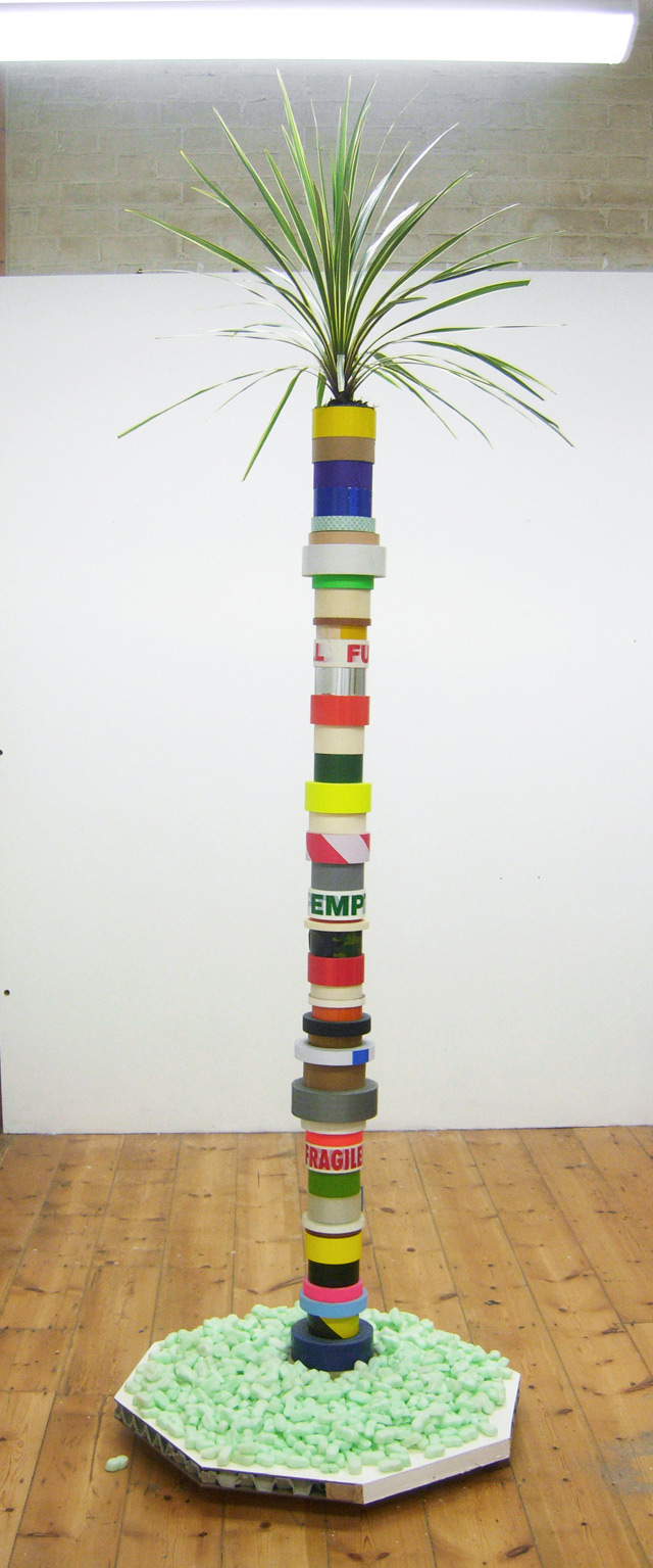 Fine art wise, I’ve chosen two pieces that perhaps illustrate different facets for the way I make things. I collect and hoard a lot of things, not necessarily with the intention of using them in a piece of work, but just because certain objects trigger something in me. Totem Palm started with one of those collections, a series of rolls of different coloured or interesting tape I had begun to amass in my studio. The collecting became a bit more focused and this totemic pillar of tape began to emerge. In the end the resulting sculpture, topped with a fake plant and sitting on it’s packing island, is part monument and part fantasy, pagan island. The collection elicits a response from me and suggests other materials, objects or ways of working that will allow it to become something else.