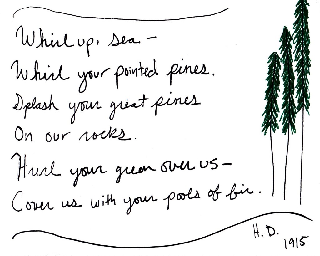H.D. was born in 1886 and she died in 1961. She was part of a group of poets in England (herself, Richard Aldington, and Ezra Pound) who called themselves Imagists. She lived an intensely full and colorful life and was incredibly progressive in her lifestyle and politics. She was a feminist and became a symbol for the movement after her death. She was an elective patient of Sigmund Freud. She had long and intense romantic relationships with both men and women. She was strong and determined and when I read her work it’s clear to me that she was always searching and asking questions. She was really searching for herself amidst all the things that swirled around her in a time in history when asking those questions was especially hard, especially for women. Her poems are simultaneously reflective and expressive of deep emotion, while at the same time carrying this voice of incredible strength and self possession.
